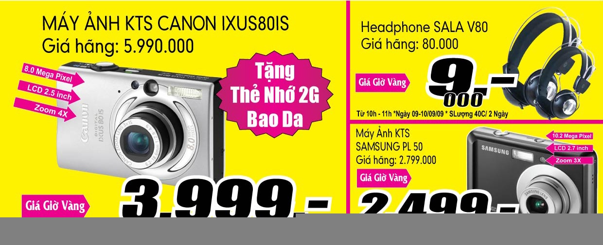 - Máy ảnh Canon IXUS 80IS giá hãng 5.990.000 đồng giá giờ vàng 3.999.000 đồng.