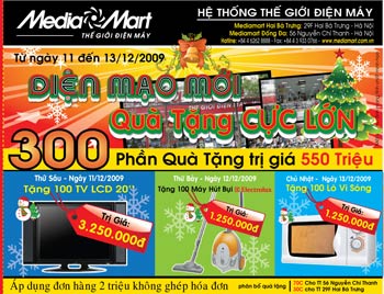 Đặc biệt, từ ngày 11-13/12, nhân dịp khai trương mở rộng, Mediamart đưa ra chương trình khuyến mại “Diện mạo mới – Quà tặng cực lớn” với 300 phần quà tặng hấp dẫn (áp dụng cho đơn hàng trên 2 triệu đồng (không ghép hóa đơn) trị giá 550 triệu đồng và hàng ngàn cơ hội mua sắm, sở hữu các sản phẩm với mức giá giảm hợp lý.