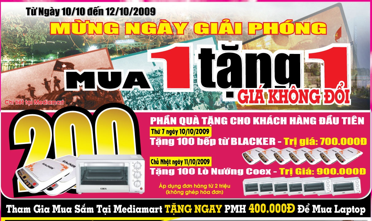 (VTC News) - Bán phá giá mỗi ngày một mặt hàng, giảm giá giờ vàng, tặng quà ưu đãi... là hàng loạt chiêu "câu khách" của các siêu thị điện máy nhân Ngày Giải phóng Thủ đô 10/10. » Những chiêu khuyến mại “đánh đố” khách hàng » Big C giảm giá hoá mỹ phẩm từ 10 - 50% mừng 20/10 » Mediamart giảm giá laptop HP gần 1 triệu đồng trong 10 ngày “Mừng ngày Giải Phóng - Tưng bừng quà tặng” với Media Mart Song song với “10 ngày vàng HP”, Media Mart còn tung ra chương trình đặc biệt trong hai ngày 10/10 và 11/10 với nhiều ưu đãi lớn. Cụ thể, trong chương trình mua 1 tặng 1, khách hàng sẽ có cơ hội sở hữu ngày một bộ nồi Goldsun cao cấp trị giá 500.000 đồng khi mua đơn hàng có trị giá từ 500.000 đồng trở lên trong khoảng thời gian từ 14h đến 18h30 hai ngày 10 & 11/10. Media Mart vừa tung ra chương trình đặc biệt trong hai ngày 10/10 và 11/10 với nhiều ưu đãi lớn. Ngoài ra, Medimart giành 200 phần quà đầu tiên cho khách hàng khi mua đơn hàng trừ 2 triệu đồng trở lên: Thứ 7, ngày 10/10 tặng 100 bếp từ Blacker trị giá 700.000 đồng; Chủ nhật, ngày 11/10 tặng 100 lò nướng Coex trị giá 900.000 đồng. Cùng với đó, giờ vàng giá cực sốc được tổ chức từ 10h30-11h30 hai ngày 10 & 11/10 sẽ mang đến cơ hội sở hữu các sản phẩm với mức giá giảm đáng kể như: điện thoại di động Nokia 1202 có giá chỉ còn 199.000 đồng giảm 401.000 đồng so với giá hãng, lò vi sóng R218 giá giờ vàng còn 990.000 đồng trong khi giá hãng 1.740.000 đồng, nồi hầm Sikma C20 còn 290.000 đồng giảm so với giá hãng 400.000 đồng. Cơ hội mua LCD LG 32LF 15 chỉ với giá 3.990.000 đồng áp dụng cho các khách hàng đã mua hàng tại Mediamart với đơn hàng từ 50.000 đồng trở lên & tham gia bốc thăm may mắn được tổ chức vào 11h ngày kế tiếp. Mua LCD Sharp 42’ trở lên được tặng bộ phát hình di động PVR HDD Player trị giá 4.800.000 đồng. Để biết thêm thông tin chi tiết, tham khảo trên trang web chính của mediamart: www.mediamart.com.vn hoặc gọi số 098 357 1919 .