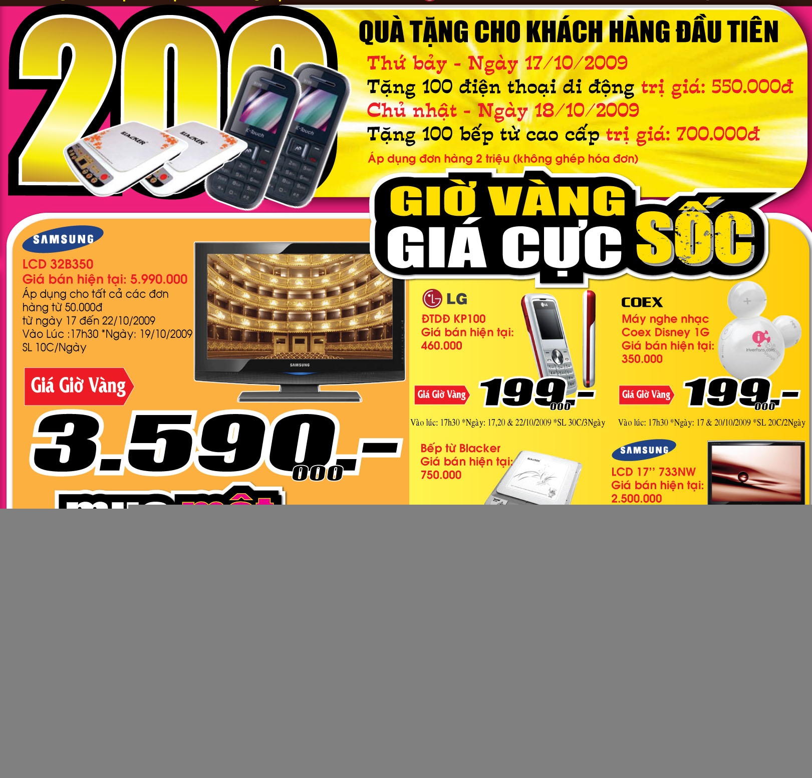 Ngoài ra, với hóa đơn mua hàng trị giá 50.000 đồng, khách hàng sẽ được tham gia bốc thăm mua các sản phẩm điện tử, điện lạnh, gia dụng, IT, KTS, mobile mới mức giá “sốc”, như máy nghe nhạc Coex hay điện thoại di động KP100 giá 199.000 đồng; màn hình LCD Samsung giá 1.500.000 đồng, giảm 1.000.000 đồng so với giá hiện tại; TV Samsung 32B350 với giá 3.590.000 đồng, giảm 2,5 triệu đồng so với mức giá hiện tại; điện thoại LG KP100 với giá 199.000 đồng.