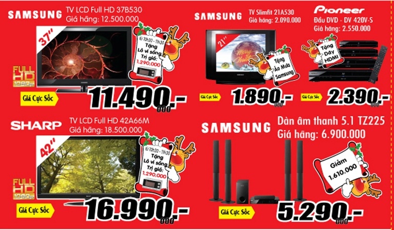 Cùng với đó, các ngành hàng còn đồng loạt giảm giá các mặt hàng khuyến mại như: Khung ảnh Kỹ thuật số Samsung SPF-87H giá khuyến mại chỉ còn 990.000 đồng giảm 1.600.000 đồng; Máy ảnh kỹ thuật số Canon 80IS giá khuyến mại còn 3.890.000 đồng giảm 1.000.000 đồng so với giá hãng, TV Samsung 32B350 giá khuyến mại 5.990.000 đồng giảm 1 triệu đồng so với giá hãng; Tủ lạnh Sharp SJ – K43MK2 giá khuyến mại còn 9.090.000 đồng giảm 500.000 đồng so với giá hãng, đồng thời tặng lò vi sóng Coex trị giá 1.290.000 đồng.