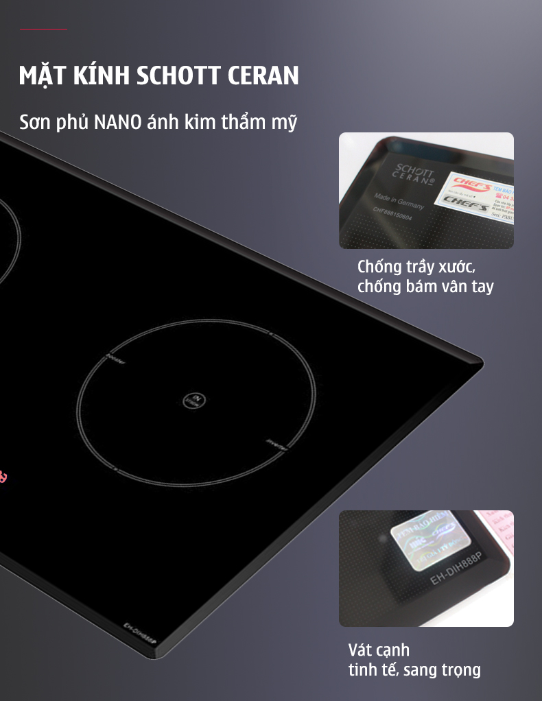 Nếu như mẫu bếp từ Chefs EH-DIH888P sở hữu một mặt bếp là một mặt kính gốm Schott đen tuyền sang trọng tuy nhiên khả năng chống trầy xước kém, sau 1 thời gian sử dụng mặt bếp sẽ bị cào xước làm mất độ thẩm mỹ cho chiếc bếp. Nhằm khắc phục và nâng cao khả năng chống xước thì ở mẫu bếp từ Chefs EH DIH888P (2021) đã được trang bị một mặt kính Schott và được sơn phủ nano thẩm mỹ ánh kim chống xước, không bám vân tay, do đó mặt bếp sẽ giữ được độ thẩm mỹ cao nhất sau nhiều năm sử dụng bếp.