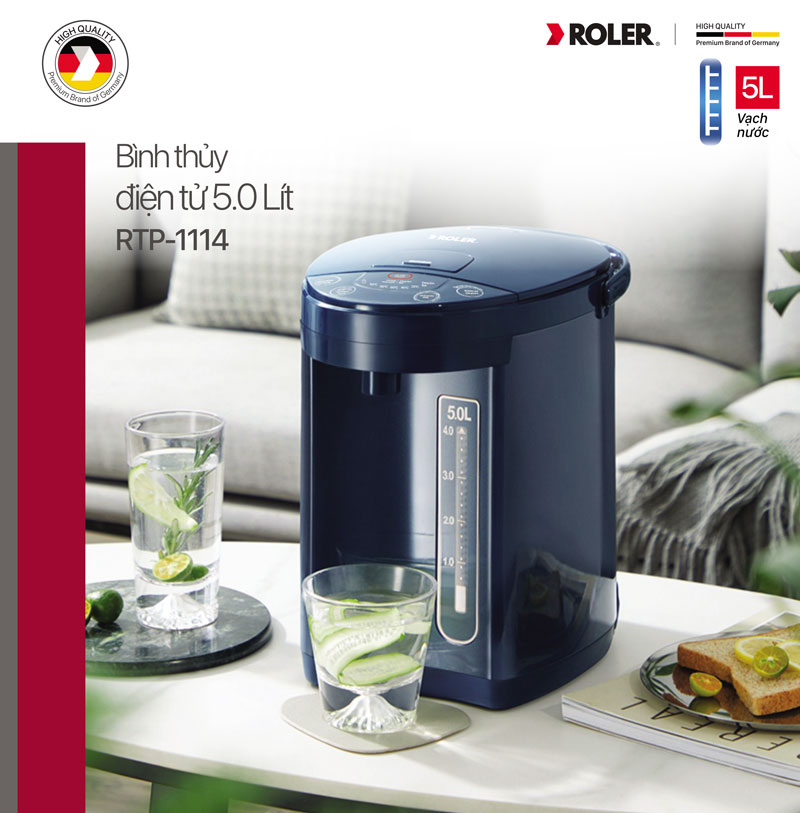 Bình thủy điện tử Roler RTP-1114 sở hữu dung tích cực đại lên đến 5 Lít, là giải pháp hoàn hảo cho các gia đình đông thành viên hoặc môi trường văn phòng. Kết hợp với công suất 1200W mạnh mẽ, sản phẩm cho khả năng đun sôi nước thần tốc, giúp bạn tiết kiệm tối đa thời gian chờ đợi mà vẫn luôn có sẵn nước nóng sử dụng cả ngày dài.