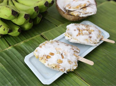 - Những miếng kem chuối ép mát lạnh là một sự hài hòa về hương vị giữa cái ngọt thơm của chuối sứ chín, béo béo của dừa nạo và giòn thơm của đậu phộng. Món ăn tuy dân dã, đơn giản này nhưng chắc chắn sẽ chinh phục được cả những người khó tính nhất.