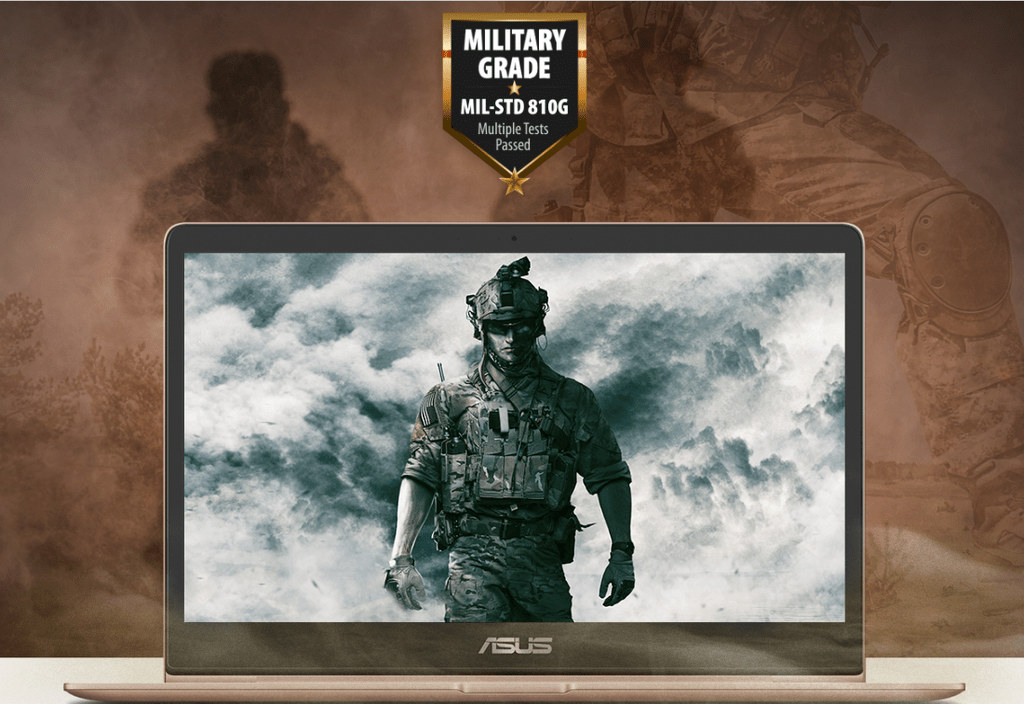 Với tư cách là người mở đường, ASUS đương nhiên cũng không chịu kém cạnh khi là một trong những hãng sản xuất tỏ ra chịu chơi nhất với chuẩn MIL-STD, cũng là hãng có số Model đạt chuẩn quân đội Mỹ vượt trội so với phần còn lại. Có rất nhiều các dòng Laptop của ASUS đạt chuẩn quân đội Mỹ, như các dòng Zenbook hay mới đây là dòng ExpertBook B9 siêu nhẹ, thời lượng pin 24h. Riêng với dòng ASUS TUF Gaming của ASUS hiện tại đã đạt chuẩn 810H, tức là cao cấp hơn so với dòng tiêu chuẩn 810G phổ biến hiện nay.