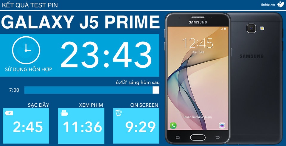 Samsung Galaxy J5 Prime được nhà sản xuất trang bị cho viên pin 2.400 mAh và qua thử nghiệm thực tế cho thấy máy có thể on screen được gần 9 tiếng rưỡi, cho thời gian sử dụng hỗn hợp lên đến gần 24 tiếng và xem phim liên tục được hơn 11 tiếng 30 phút. Dưới đây là các nội dung chi tiết hơn về thời gian sử dụng pin của máy cũng như quy trình mình thực hiện để cho ra các số liệu kể trên, mời các bạn theo dõi.