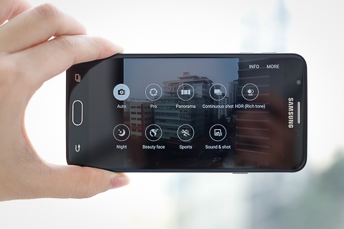 Khả năng bắt nét và tốc độ chụp khá nhanh, chỉ trong vòng 1 giây. Ở điều kiện đủ sáng, ảnh chụp cho độ chi tiết khá. Ống kính khẩu độ lớn giúp cho các bức ảnh chụp cận cảnh có hiệu ứng xoá phông tốt. Tính năng chụp HDR ở Galaxy J7 Prime hoạt động hiệu quả, đem lại hiệu quả rõ rệt so với chế độ chụp thường. Tuy nhiên, ở điều kiện thiếu sáng, ảnh bất đầu thể hiện nhiễu khá nhiễu và bệt màu. Việc lấy nét, chụp khó hơn.