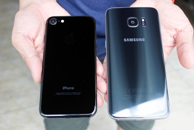 iPhone 7 có những góc bo cong nhìn bóng bẩy thời thượng, trong khi đó Galaxy S7 edge lại tạo cảm giác cứng cáp.Cuộc thi của cả 2 đang ở thế cân bằng, bỗng dưng chúng tôi phát hiện ra vấn đề khiến iPhone 7 Jet Black bị mất điểm ngay trước đối thủ đến từ Samsung: