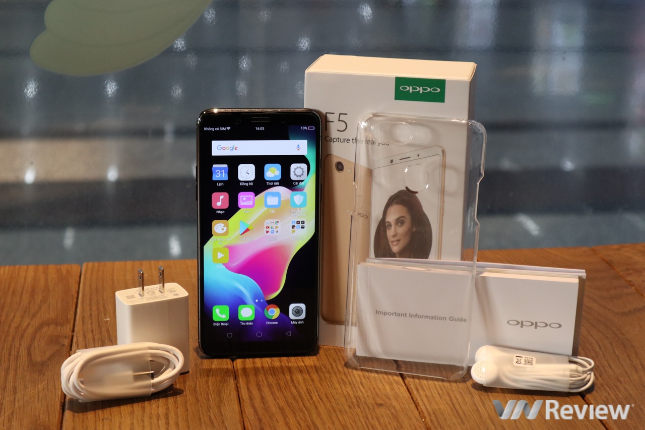 Chiếc Oppo F5 lên kệ từ ngày 11/11 với giá 6,99 triệu đồng, hai lựa chọn màu vàng và đen. Điểm nhấn ở sản phẩm này là thiết kế màn hình 6 inch viền mỏng tỷ lệ 18:9 cùng với camera trước 20MP có tích hợp công nghệ trí tuệ nhân tạo để cải thiện ảnh chụp selfie. Các thông số cấu hình còn lại của máy gồm vi xử lý Helio P23 với 8 nhân tốc độ 2.5Ghz, RAM 4GB, bộ nhớ trong 32GB, camera sau 16MP, hỗ trợ 2 SIM LTE 4G và đang cài sẵn phiên bản Color OS 3.2 dựa trên Android 7.1.1.