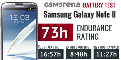 Nếu sử dụng lần lượt các tính năng đàm thoại trên mạng 3G, lướt web với kết nối Wi-Fi hay xem video trên màn hình điện thoại một giờ hằng ngày, tổng thời gian sử dụng của Galaxy Note II cao tới 73 giờ, gần gấp đôi nhiều smartphone Android khác như Galaxy S III hay One X. Model của Samsung cũng cho kết quả tốt hơn hẳn iPhone 5 (51 giờ). Dù vậy, chất lượng pin của Note II vẫn tạm thời đứng dưới đối thủ Razr Maxx pin khủng 3.300 mAh từ Motorola.