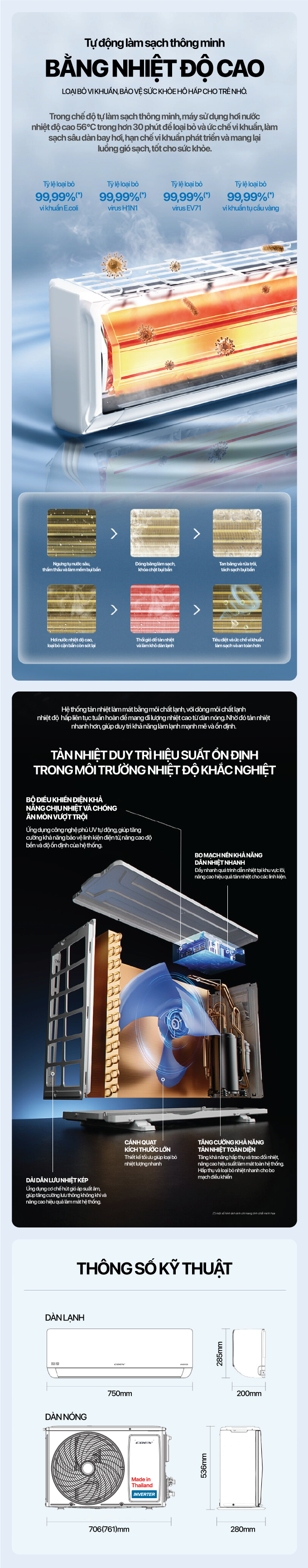 Màn hình LED tích hợp trên dàn lạnh giúp người dùng dễ dàng quan sát và điều chỉnh chế độ, đặc biệt thuận tiện khi sử dụng ban đêm. Thiết kế tinh gọn với kích thước IDU 750×285×200 mm, ODU 709(761)×280×536 mm, phù hợp nhiều không gian nội thất.