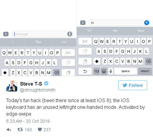 Nhà phát triển phần mềm Steve Troughton-Smith cho biết anh đã phát hiện ra một đoạn mã ẩn của hệ điều hành iOS, đó là một ứng dụng bàn phím ảo đặc biệt mà không ai biết đến. Ứng dụng bàn phím này đã có trên tất cả iPhone từ iOS 8, được thiết kế để sử dụng chỉ bằng một tay.