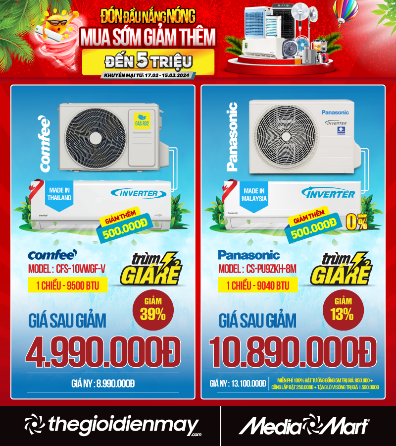 Cụ thể: Dòng điều hòa Inverter công suất từ 9.000BTU phổ biến nhất có giá mua sớm giảm đến 39%. Trong đó điều hòa Comfee 1 chiều Inverter 9.500BTU CFS-10VWGF-V giá niêm yết 8,99 triệu đồng, giá khuyến mại 5,49 triệu đồng, nay MediaMart tiếp tục giảm thêm 500,000đ, giá bán ra chỉ 4,99 triệu đồng; Điều hòa Panasonic 1 chiều Inverter 9.040BTU CS-PU9ZKH-8M giảm còn 10,89 triệu đồng.