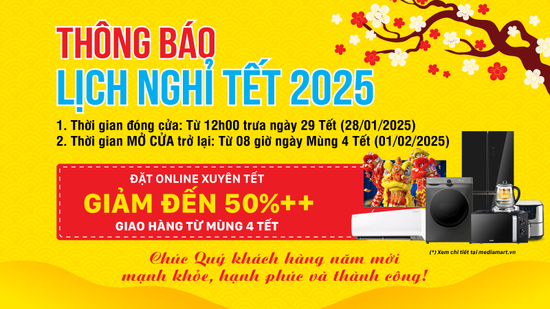 Thông báo lịch nghỉ Tết Âm lịch 2025 tại MediaMart: Khuyến Mại xuyên Tết (-50%) - Tết vẫn giao hàng