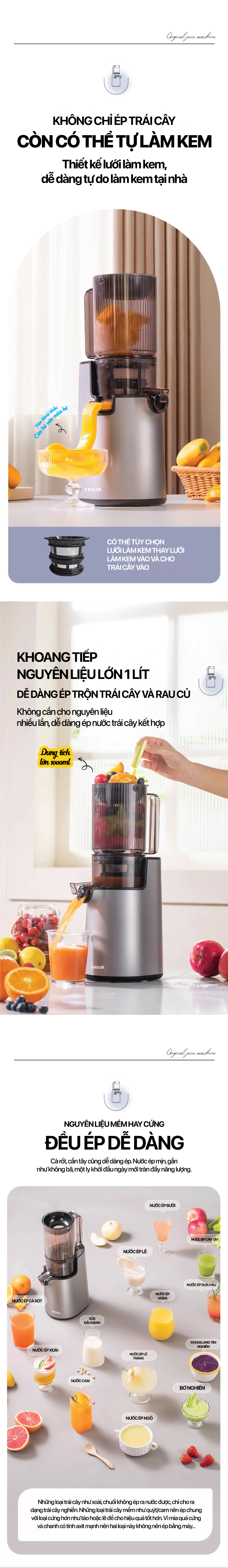 Ống tiếp nguyên liệu lớn có đường kính 85mm cho phép ép đồng thời nhiều loại trái cây, rau củ trong một lần, ép nguyên trái cây giúp ép kiệt bã, giữ trọn chất dinh dưỡng mà không cần cắt nhỏ.