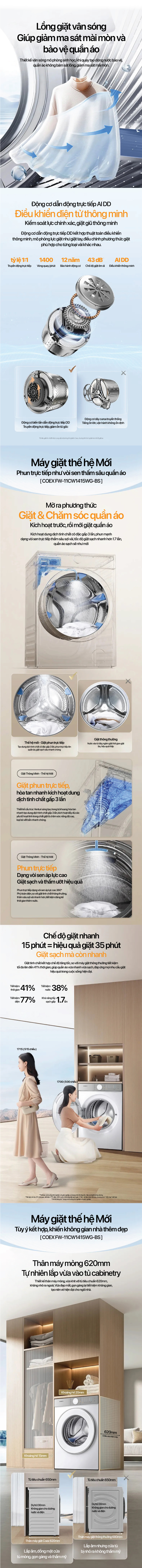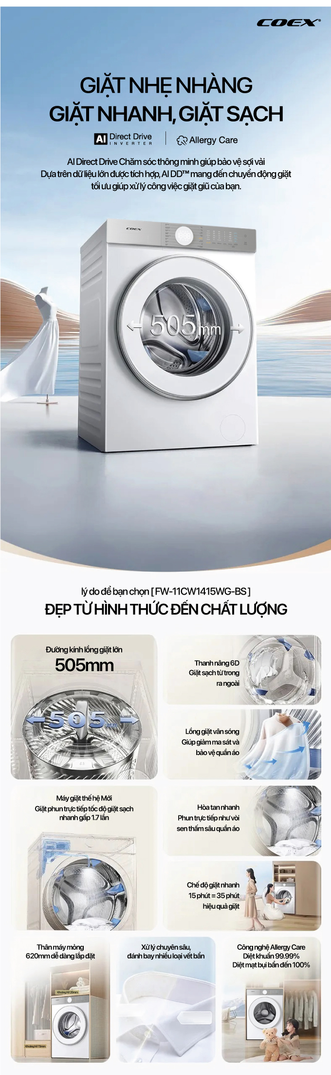 Máy giặt lồng ngang INVERTER 10.5kg COEX FW-11CW1415WG-BS được trang bị công nghệ AI DD Inverter giúp chiếc máy giặt này vận hành ổn định, tiết kiệm năng lượng, hoạt động êm ái một cách tối ưu nhất.