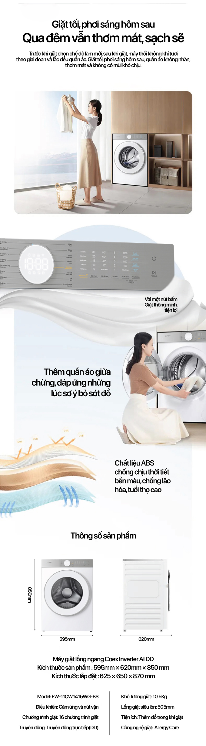 Giới thiệu: Máy giặt lồng ngang Coex Inverter 10,5kg FW-11CW1415WG-BS