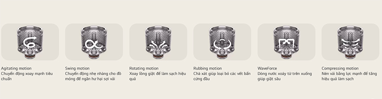 Máy giặt LG mô phỏng 6 chuyển động giặt khác nhau như giặt đập, giặt quay, giặt nén, giặt nhào trộn,… giúp quần áo được làm sạch tối ưu mà vẫn giữ được độ bền của sợi vải. Công nghệ này đặc biệt hữu ích cho những loại vải mỏng, đồ trẻ em hay trang phục cao cấp.