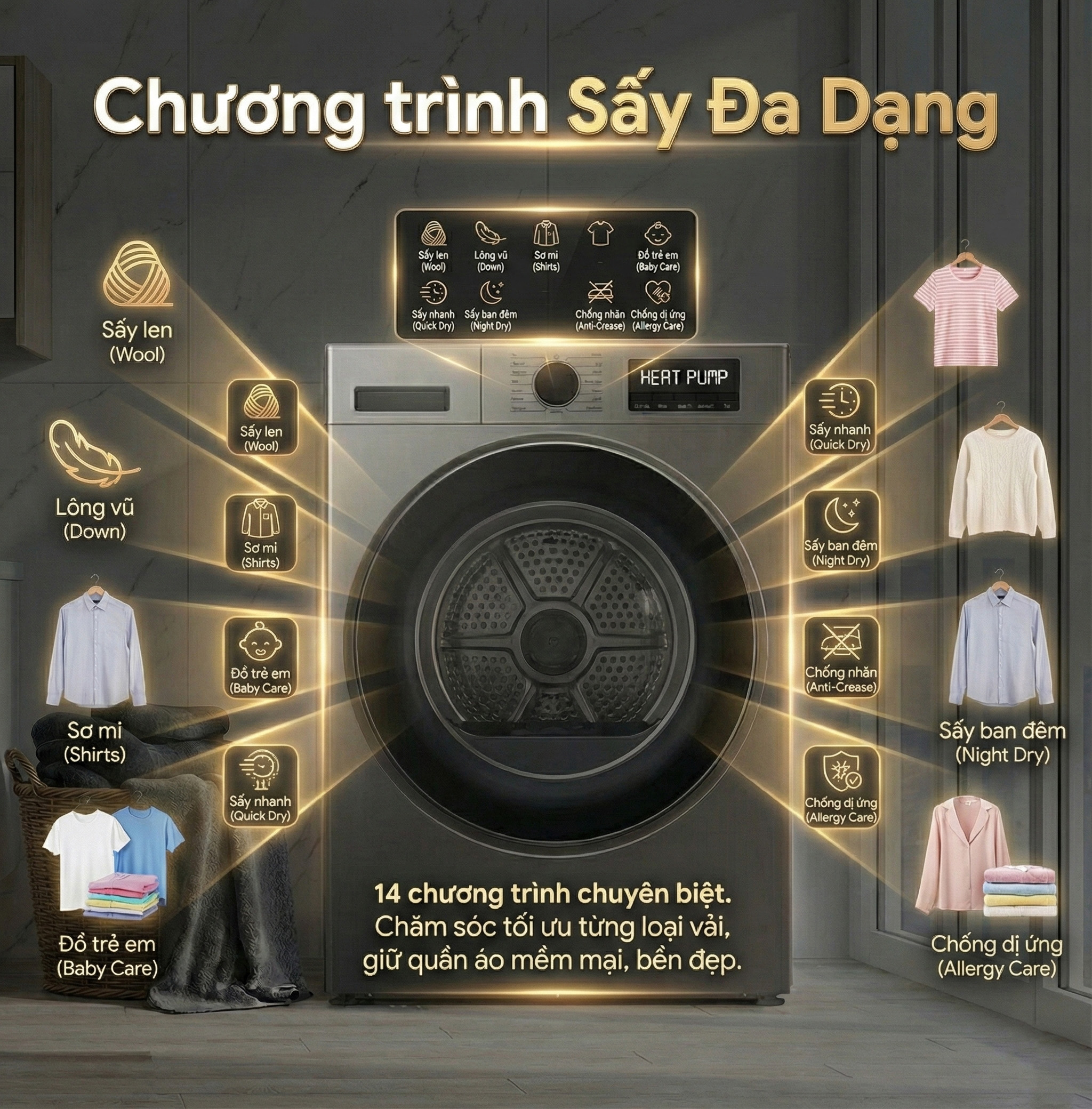 • 14 Chương trình sấy đa dạng như sấy len, sấy lông vũ, sấy sơ mi, sấy đồ trẻ em, sấy nhanh, sấy ban đêm, chống nhăn, chống dị ứng…đáp ứng mọi nhu cầu sấy