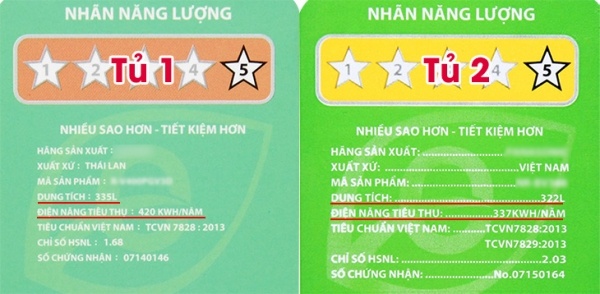 Phía trên là 2 nhãn năng lượng của 2 chiếc tủ lạnh có dung tích gần bằng nhau và đều đạt xếp hạng 5 sao nhưng nhìn vào nhãn năng lượng sẽ thấy tủ 2 lại có mức tiêu thụ điện ít hơn tủ lạnh số 1. Tức là nếu chọn chiếc tủ lạnh số 2 thì sẽ tốn điện nhiều hơn. Tuy nhiên, tủ 1 lại có dung tích lớn hơn tủ 2. Để biết tủ nào đang sử dụng điện hiệu quả và thật sự tiết kiệm điện hơn, người dùng có thể lấy số điện tiêu thụ trong 1 năm của tủ chia cho số dung tích (lít) của tủ để xem với mỗi lít dung tích tủ tiêu thụ bao nhiêu điện.