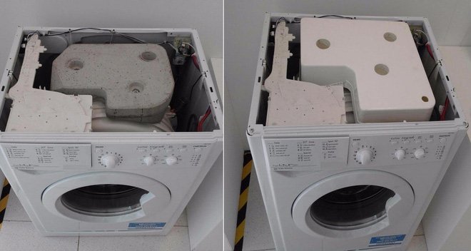 Cục nhựa rỗng chỉ nặng vỏn vẹn 3 kg. Khi máy giặt được lắp, nước sẽ được đổ đầy vào cục nhựa này và nó sẽ được niêm phong chặt lại. Thử nghiệm cho thấy cục nhựa mới cũng hiệu quả y như cục bê tông “cổ điển”.