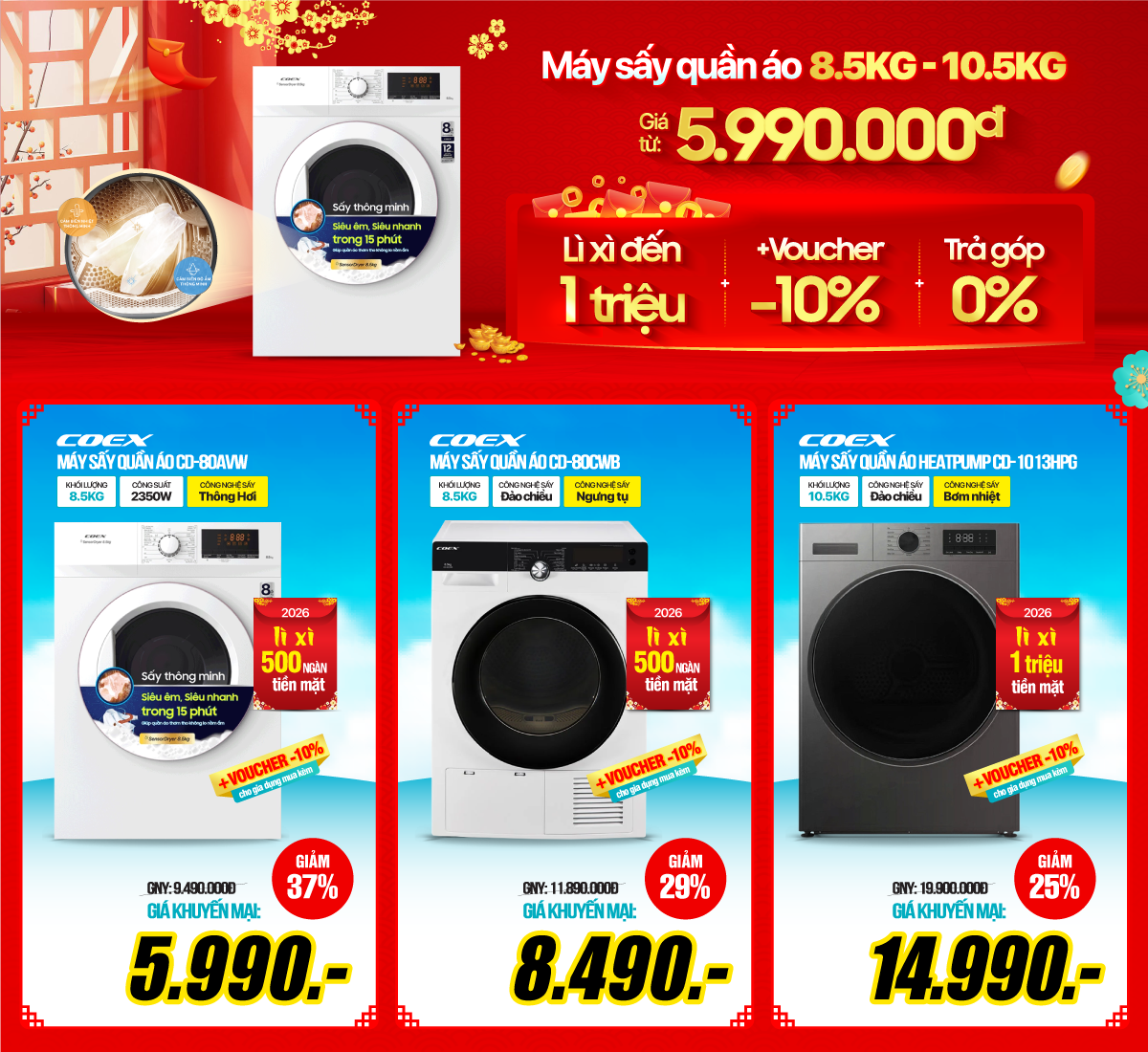 Máy sấy THÔNG MINH AI Heat Pump inverter 10.5 KG COEX - COEX CD-10HPBDS