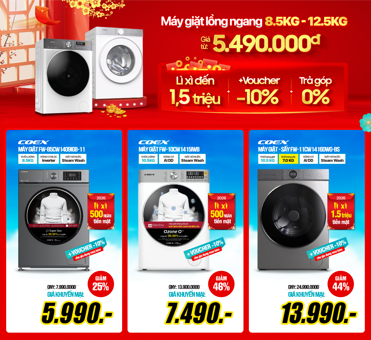 Máy giặt lồng ngang AI DD INVERTER 10.5kg COEX FW-11CW1413SG