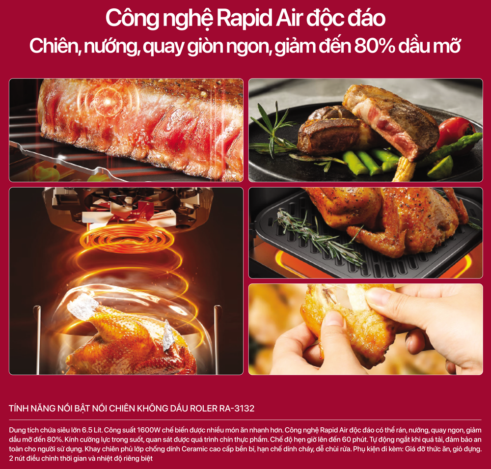 Bạn đang tìm một thiết bị nấu ăn đa năng – tiết kiệm thời gian – an toàn – tốt cho sức khỏe? Nồi chiên không dầu điện tử ROLER RA-3132 dung tích 6.5L chính là trợ thủ nhà bếp tuyệt vời, giúp bạn và gia đình thưởng thức những món ăn giòn ngon, chuẩn vị với ít dầu mỡ hơn 80%.
