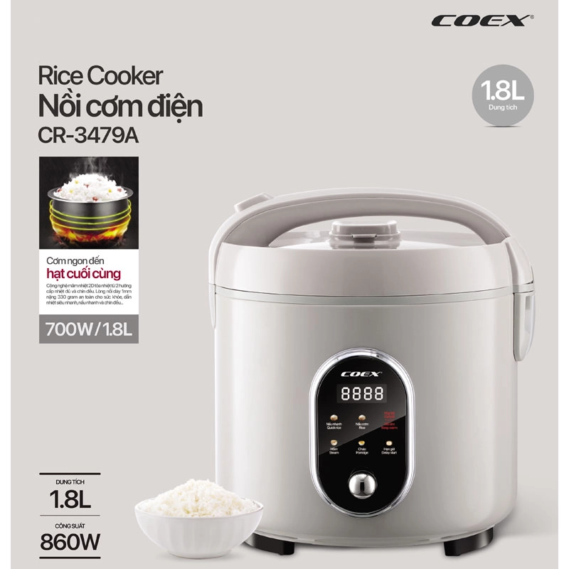 Nồi cơm điện Coex CR-3479A sở hữu công suất mạnh mẽ 860W kết hợp dung tích lớn 1.8 lít, giúp nấu cơm nhanh chóng, đáp ứng tốt nhu cầu bữa ăn cho gia đình trên 6 người mà không mất nhiều thời gian chờ đợi.