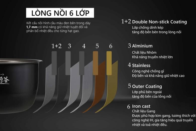 Lòng nồi của Zojirushi NW-QAQ10-BA được làm từ hợp kim nhôm và gang với độ dày 1.7mm, giúp truyền nhiệt nhanh và đều. Bên ngoài còn được phủ hai lớp men chống dính Black Thick Spherical Pan, giúp chống trầy xước, hạn chế bám bẩn và dễ dàng vệ sinh.