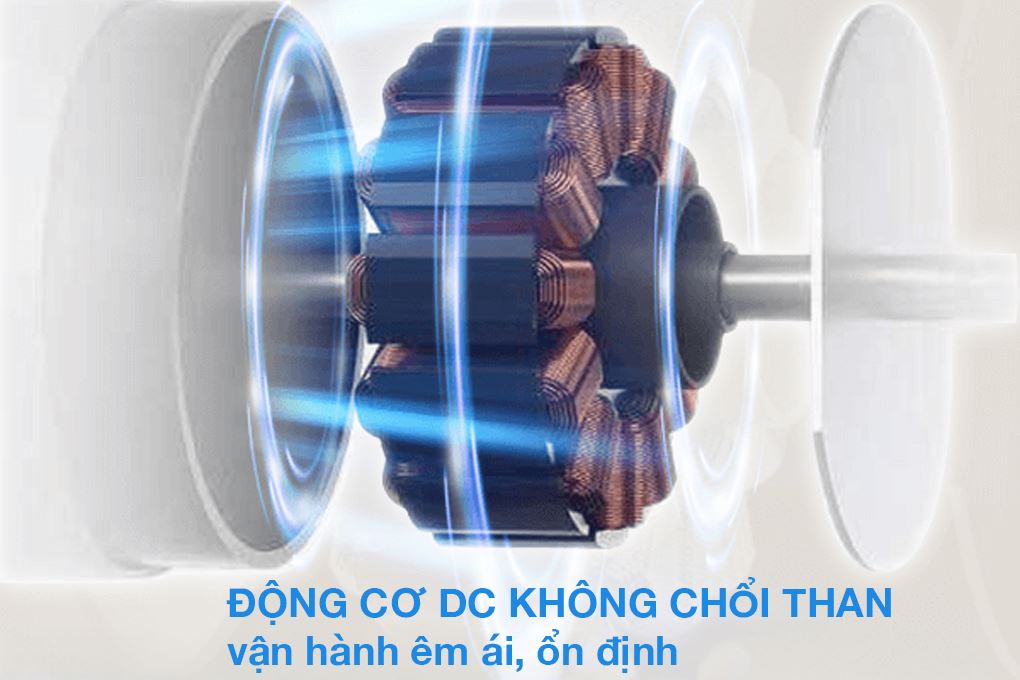 Quạt được trang bị động cơ DC không chổi than. Đây là loại motor thường được đánh giá cao ở khả năng vận hành ổn định, đồng thời phù hợp với các sản phẩm cần hoạt động êm và điều chỉnh nhiều mức gió linh hoạt.