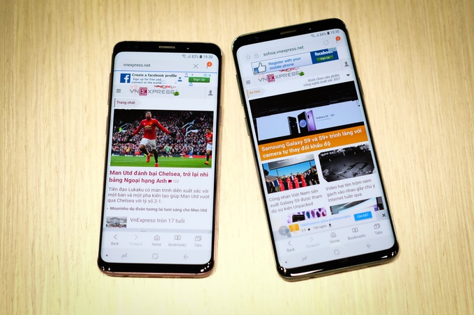 Galaxy S9 và S9+ có kích thước màn hình và độ phân giải y hệt S8 và S8+, QuadHD với kích cỡ 5,8 và 6,2 inch. Đặt cạnh iPhone X, bộ đôi của Samsung trông thon gọn hơn nhờ cạnh viền hai bên được làm mỏng và màn hình còn được bo cong nhẹ.