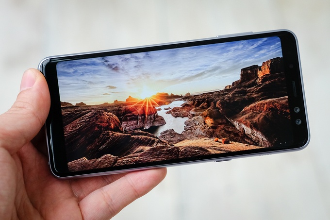 Màn hình Galaxy A8 cũng thể hiện chất lượng hiển thị tốt trong tầm tiền khi sử dụng công nghệ SuperAMOLED với độ phân giải Full HD+ 1.080 x 2.160 pixel. So với Galaxy A5 và A7 tiền nhiệm, hay đối thủ cùng tầm như iPhone 6s hay 7, Galaxy A8 cho hình ảnh nét và sáng hơn, dễ nhìn ở ngoài trời. Máy cũng hỗ trợ tính năng Always On Display.