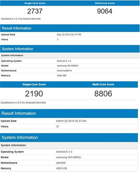 Model smartphone Samsung SM-N960N chạy Exynos 9810 xuất hiện trên website đo hiệu năng Geekbench đạt 2.737 điểm đơn nhân và 9.064 điểm đa nhân. Exynos 9810 là chip có 8 lõi và tốc độ 1,79 GHz. Trước đó, cũng trên Geekbench rò rỉ mẫu Samsung SM-N960U chạy vi xử lý Qualcomm Snapdragon 845 với 2.190 điểm đơn nhân và 8.806 điểm đa nhân.