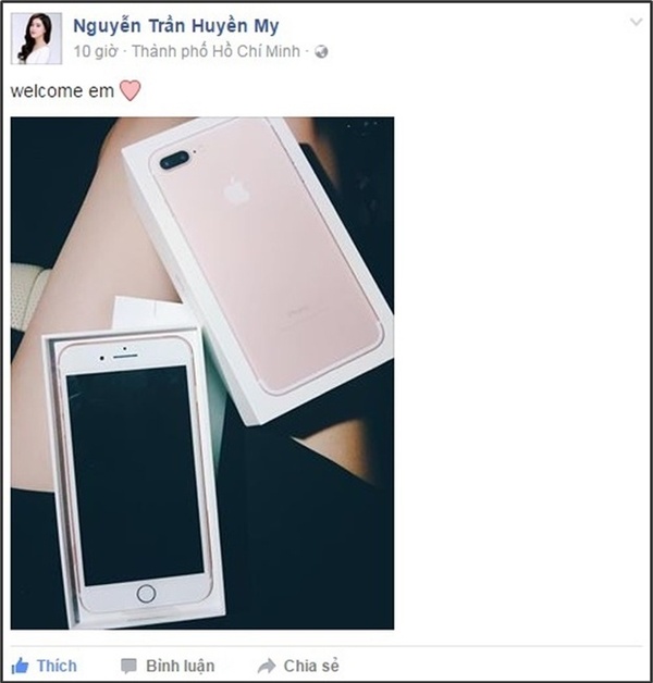 Hồi tháng 9/2016, khi Iphone 7 Plus màu hồng ra mắt và vừa về đến Việt Nam, Á hậu Huyền My cũng là người sở hữu đầu tiên.