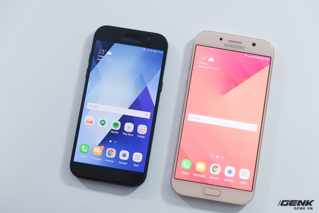 Đây là Galaxy A7 2017 màu hồng và Galaxy A5 2017 màu đen. Galaxy A7 có màn hình 5.7 inch, trong khi A5 là 5.2 inch