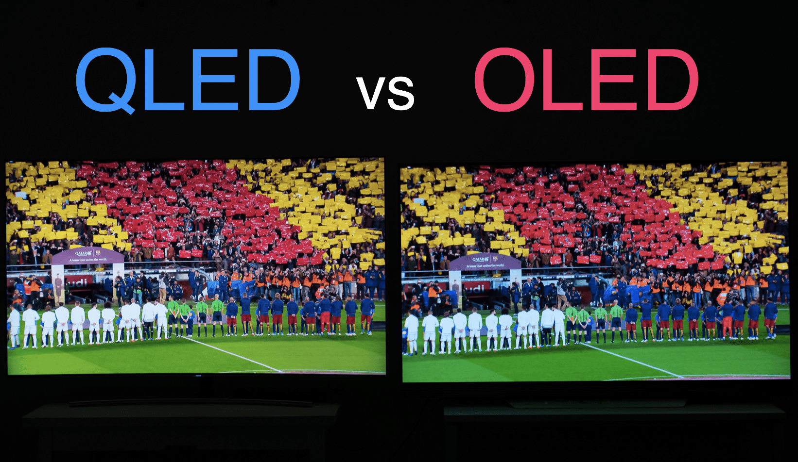 QLED được chú ý hơn khi sở hữu màn hình cong. Trong khi TV OLED lại sở hữu thiết kế mỏng như kính và nhẹ hơn nhiều. Điểm khác biệt mà hai công nghệ màn hình QLED và OLED tạo ra là độ dày. Màn hình OLED (Organic Light Emmiting Diode) có cấu tạo gồm các diode hữu cơ tự phát sáng, không cần đến đèn nền như TV LCD LED thông thường. Trong khi đó, QLED thực chất là nâng cấp từ LCD LED truyền thống khi vẫn sử dụng hệ thống đèn nền LED nhưng có thêm công nghệ chấm lượng tử Quantum Dot.