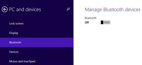 Để tắt chức năng Bluetooth, bạn vào Settings trên thanh Windows Charm, nhấn chọn Change PC settings > PC and devices > Bluetooth, sau đó gạt thanh trang thái Bluetooth sang OFF là xong.