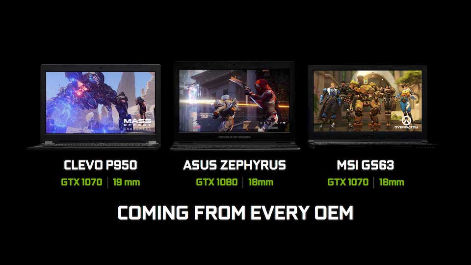 Cụ thể, tại sự kiện diễn ra vào Thái Lan mới đây, Nvidia đã ra mắt 3 chiếc laptop hoàn toàn mới được phát triển dựa trên tiêu chuẩn Max-Q Design là Clevo P950HR (dùng card GTX 1070), MSI GS63 (GTX 1070) và Asus ROG Zephyrus GX501 (GTX 1080). Cả ba máy đều rất nhỏ gọn và có độ dày chỉ từ 18mm cho đến 19mm, cho phép người sử dụng có thể thoải mái mang máy đi khắp nơi như một chiếc laptop cơ bản.