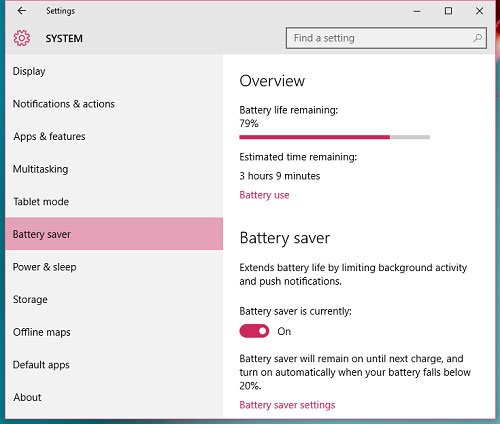 Khi bật tính năng Battery Saver, hệ điều hành sẽ tự động tạm dừng gửi/nhận email và cập nhật ứng dụng lịch làm việc Calendar, Live Tile và hạn chế các ứng dụng chạy nền.