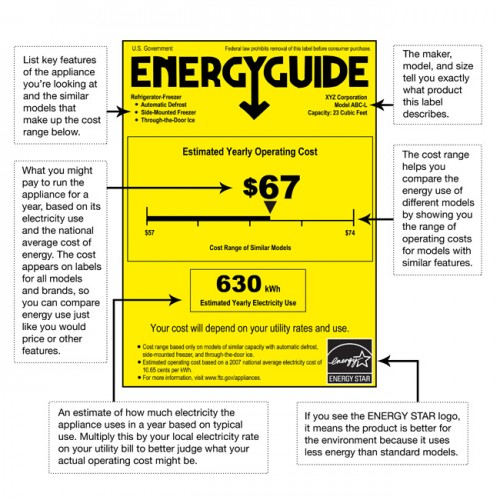 Tìm các mẫu có nhãn dán màu vàng sáng hoặc thẻ trên thiết bị có dòng chữ “Energy Guide”. Nhãn này sẽ cho bạn biết một đồ gia dụng sử dụng hết bao nhiêu điện năng và có thể giúp so sánh mức sử dụng năng lượng của các thiết bị khác nhau. Chi phí trên nhãn EnergyGuide dựa theo giá điện trung bình toàn quốc và mức sử dụng năng lượng trung bình của đồ gia dụng đó. Chi phí bạn phải trả phụ thuộc vào giá điện và mức độ thường xuyên sử dụng thiết bị đó.
