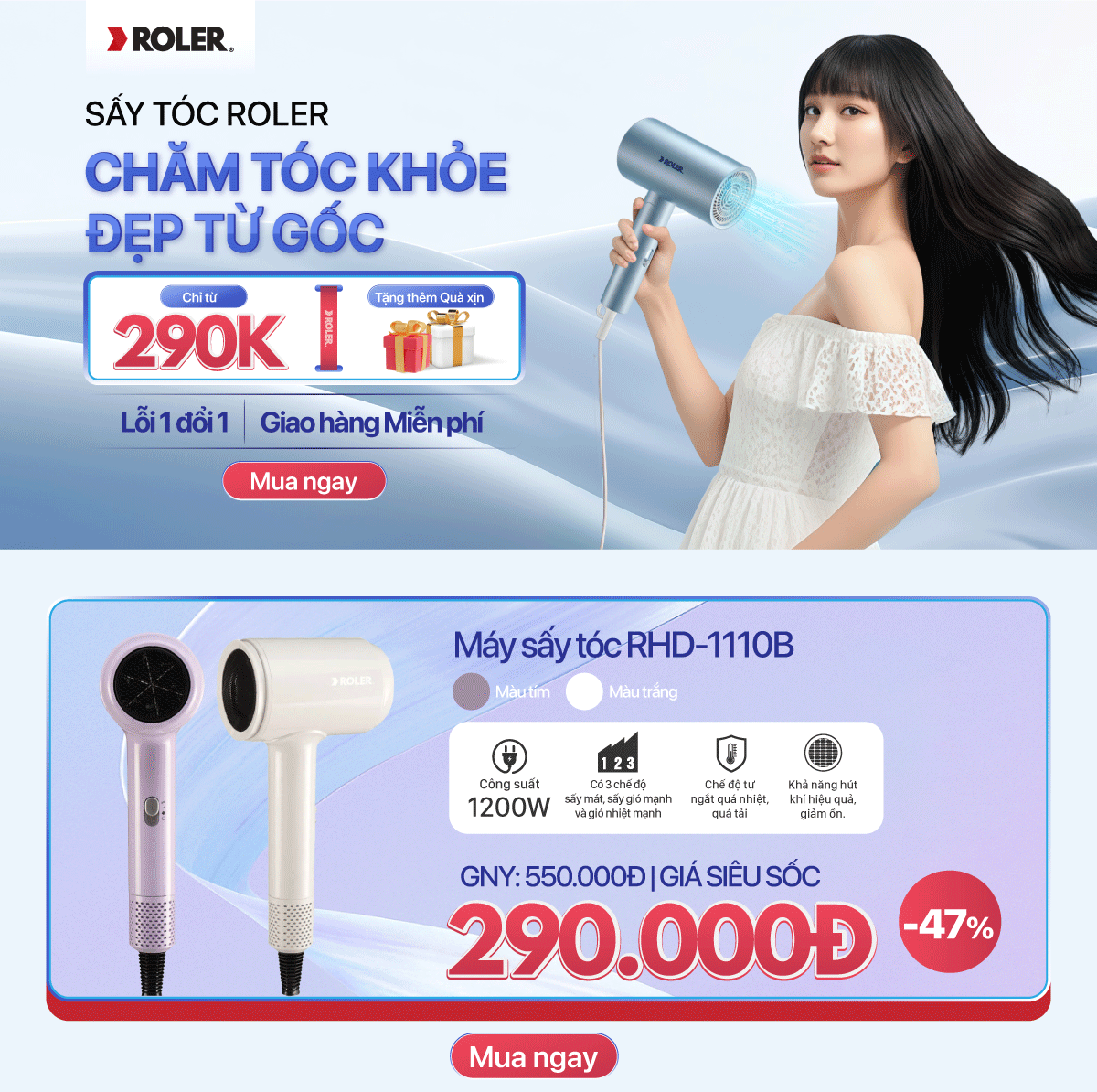 Máy sấy tóc Roler 1000W RHD-1110G (Màu tím)