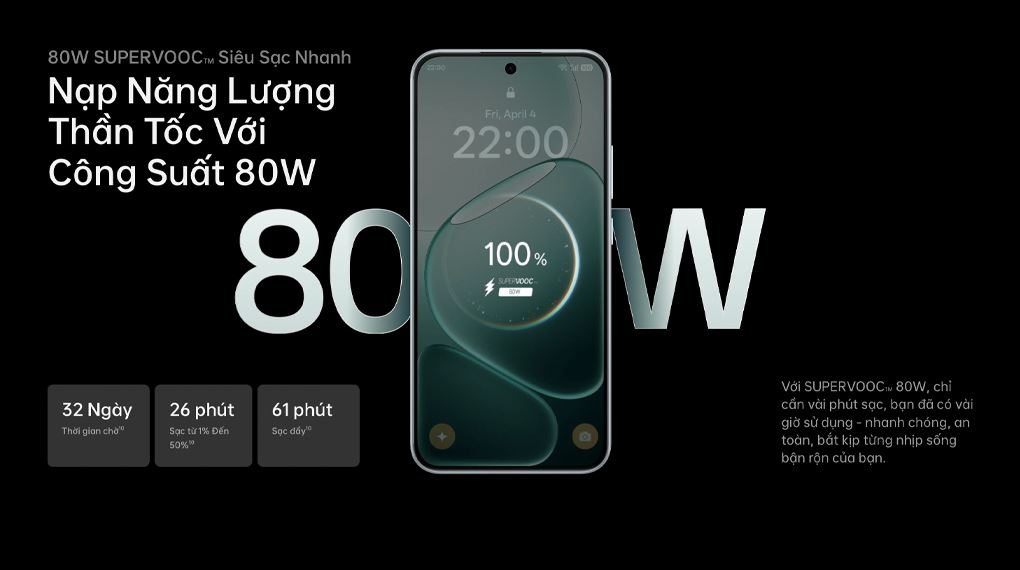 • Sạc nhanh SUPERVOOC 80W, nạp 50% dung lượng pin trong 26 phút.