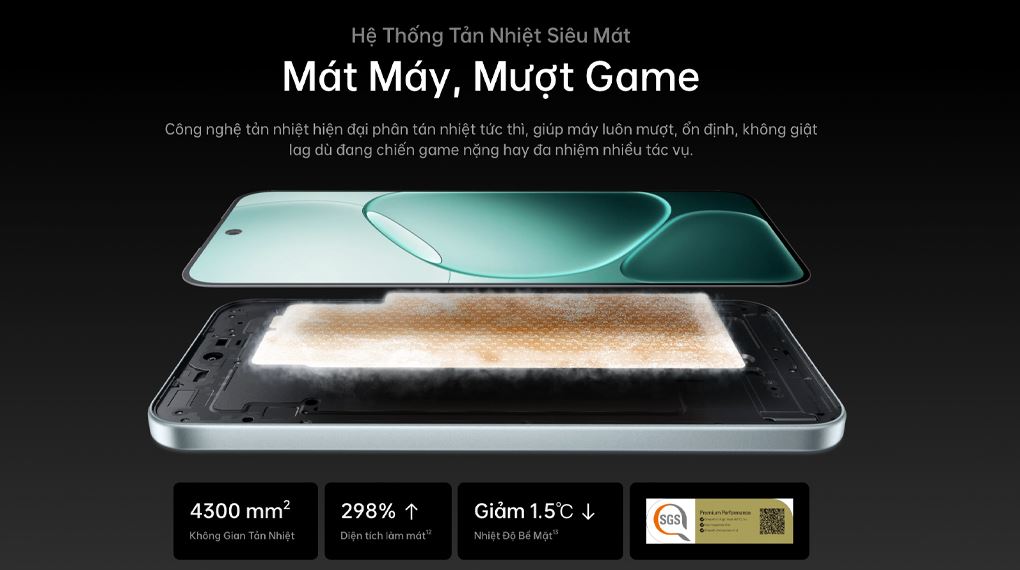 Chiếc điện thoại OPPO này sử dụng hệ thống tản nhiệt với diện tích làm mát 4300 mm² để phân tán nhiệt từ vi xử lý và linh kiện khi hoạt động nặng, đặc biệt trong lúc chơi game lâu. Cách kiểm soát nhiệt này giúp duy trì hiệu suất ổn định, hạn chế giảm tốc do quá nhiệt và mang lại trải nghiệm sử dụng mượt mà hơn.