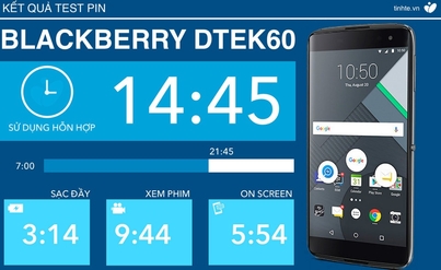 BlackBerry DTEK60 với viên pin dung lượng 3.000 mAh cho thời gian sử dụng hỗn hợp 14 giờ 45 phút, onscreen được gần 6 tiếng và xem phim liên tục được chưa đến 10 tiếng.
