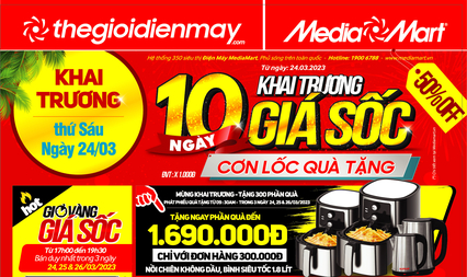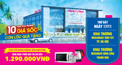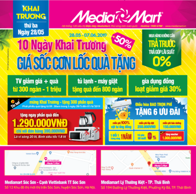 • 10 ngày giá sốc cơn lốc quà tặng mừng MediaMart khai trương 2 siêu thị mới: MediaMart Sóc Sơn - Hà Nội & MediaMart Lý Thường Kiệt - Thái Bình