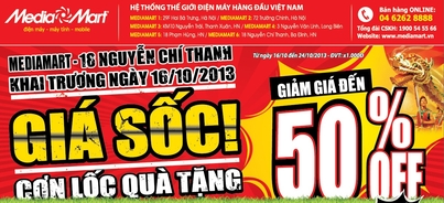 Từ 16/10 đến 24/10, chào mừng khai trương siêu thị thứ 7 tại 18 Nguyễn Chí Thanh, HN, Media Mart tặng ngay 2000 bếp ga đôi, bình siêu tốc trị giá 790.000 đồng cho đơn hàng từ 399.000 đồng; 18000 mặt hàng giảm giá tới 50%, giảm thêm 5% khi thanh toán qua thẻ Vietinbank...
