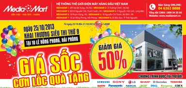 Từ 25/10 đến 31/10, chào mừng khai trương siêu thị thứ 8 tại 10 Lê Hồng Phong- Hải Phòng, Media Mart tặng ngay 1500 bếp ga đôi, bình siêu tốc trị giá 790.000 đồng cho đơn hàng từ 399.000 đồng; 18000 mặt hàng giảm giá tới 50%, chi tiêu 500.000 đồng trúng tới 50 triệu khi thanh toán qua thẻ Vietinbank...