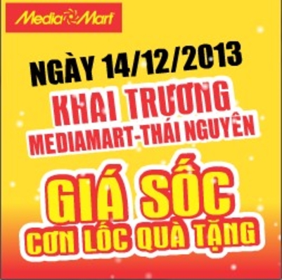 Ngày 14/12, Media Mart chính thức khai trương siêu thị điện máy thứ 9 tại số 3 Bắc Cạn, Tp Thái Nguyên. Để chào mừng sự kiện đặc biệt này, Media Mart mang đến chuỗi khuyến mại “Giá sốc cơn lốc quà tặng” gây chấn động thị trường bán lẻ điện máy cuối năm với 9000 sản phẩm giảm giá đến 50%, 300 quà tặng miễn phí, ưu đãi mua 1 tặng 1, …