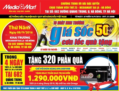 Ngày 8/9/2016, MediaMart sẽ chính thức đưa vào hoạt động siêu thị thứ 25 - MediaMart Ba La tại 682 Quang Trung, Hà Đông.  Để chào mừng sự kiện đặc biệt này, Media Mart mang đến chương trình “10 ngày Giá sốc cơn lốc quà tặng”.